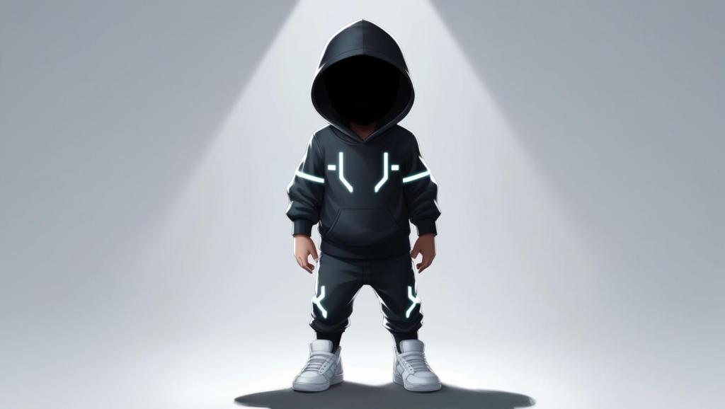 Prumpt para Canva Dream Lab: «Create a child-like, mysterious character with small proportions, representing a figure with a lot of knowledge. The character should have a front-facing posture with a white background for easy removal. The character wears a dark hoodie that completely covers the face, casting a shadow to maintain an air of mystery. The face should remain hidden in shadow, with no visible facial features, maintaining a completely mysterious appearance. The hoodie should be simple yet sleek, with subtle glowing details or neon accents. The overall look should be futuristic and digital, incorporating tiny, subtle elements of technology, like circuit patterns or digital symbols. The character should radiate intelligence, curiosity, and creativity, suitable for a young audience, with youthful proportions and a sense of deep knowledge. White sneakers jordan. 8 years old».