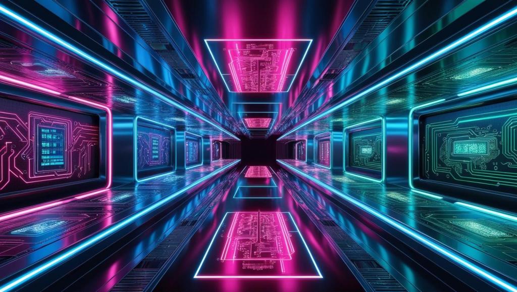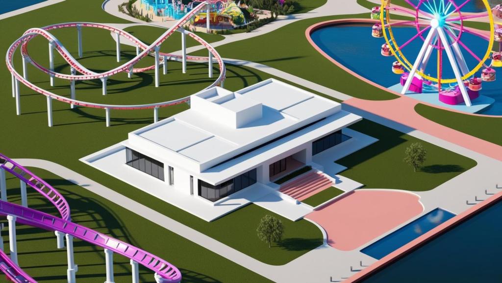 Prumpt en Canva Dream Lab: «una mansión, futurista y minimalista al centro de un parque de diversiones como Disneyland con juegos mecanicos como una montaña rusa y rueda de la fortuna. A un costado de la casa hay un pequeño lago. Vista aérea».Prumpt en Canva Dream Lab: «habitacion tecnologica infinita».